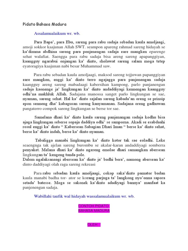Contoh pidato bahasa madura tentang kebersihan lingkungan sekolah. Teks pidato bahasa madura, mateppa' na'kana' dhengudeh emasa moderenisasi · teks pidato tiga bahasa . Komunitas pecinta seni nusantara (kpsn) menggelar lomba pidato berbahasa madura di dewan taman medan, pjs 5 petaling jaya, selangor darul . Pidato bahasa madura judul cinta roslullah saw. Kumpulan berita antara news menyajikan informasi terkini tentang pidato bahasa madura di indonesia dan dunia.